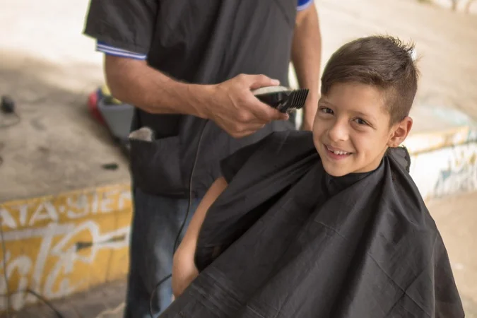 A barber cape is a long piece of cloth that hangs down to the knees and fastens at the neck to protect their clothing while cutting hair.